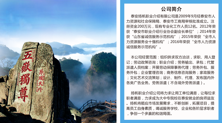 泰安揚帆職業(yè)介紹有限公司是2009年9月經(jīng)泰安市人力資源和社會保障局、泰安市工商局審核批準成立。注冊資金200萬元,現(xiàn)有專業(yè)化工作人員12名。2012年榮獲“泰安市職業(yè)介紹行業(yè)協(xié)會副會長單位”;2014年榮獲“山東省誠信服務示范機構”;2015年榮獲“全市人力資源服務業(yè)十強機構”;2016年榮獲“全市人力資源誠信服務示范機構”。